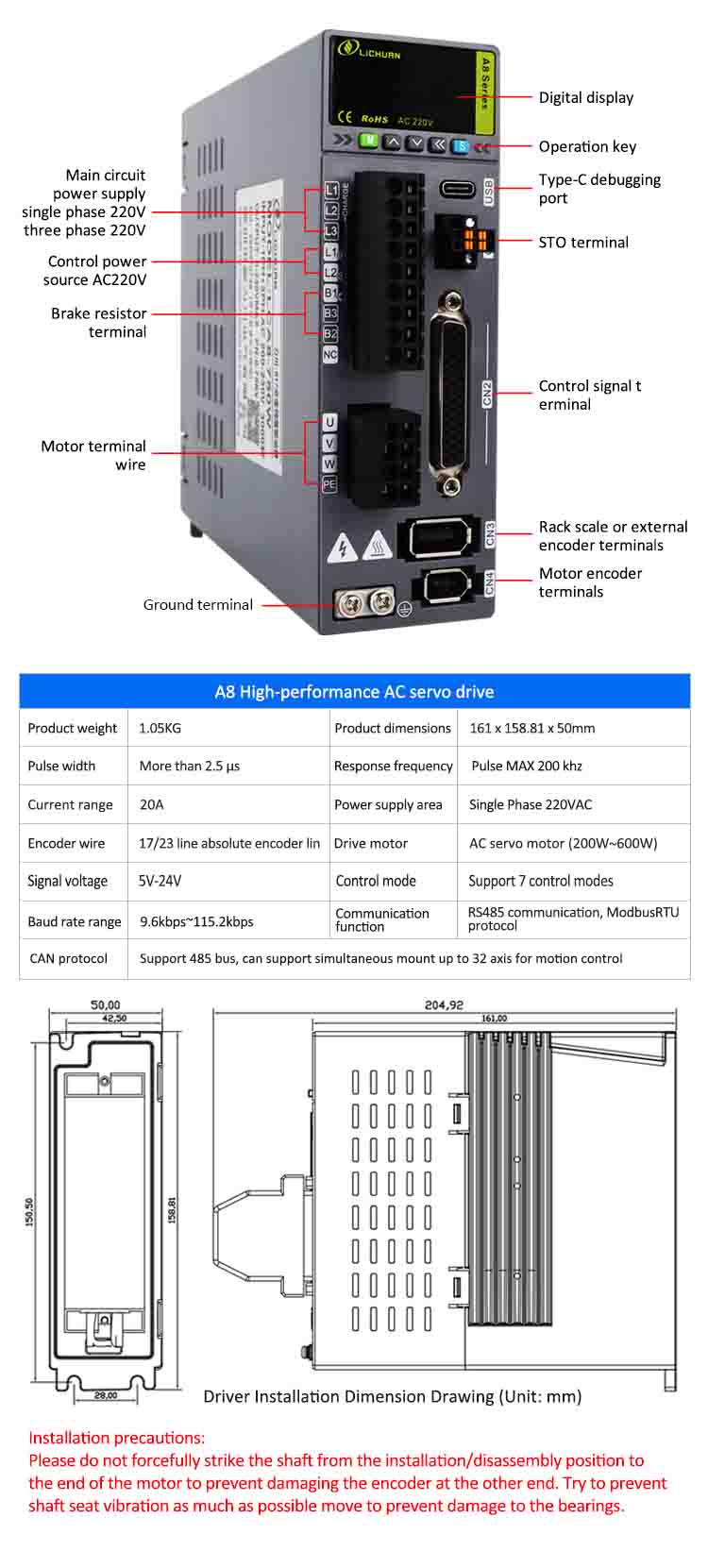Tá anLichuan A8 Cruinneas Ard STO ABZ AC Servo Motor Tiománaithe Kitatá deartha le haghaidhrialú tairiscint beacht, cobhsaí, sábháiltein innealra tionsclaíochta ar scála beag go lár.