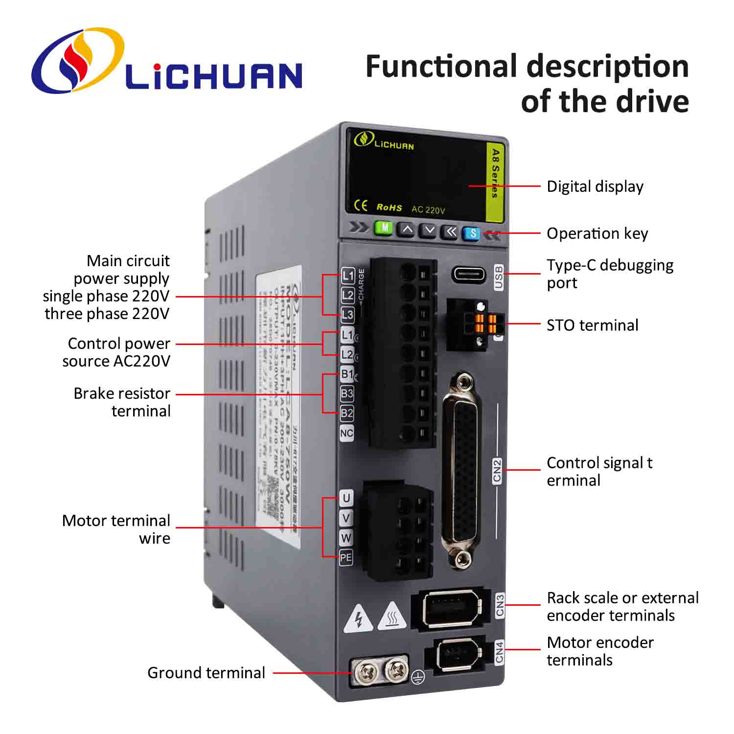 | Ainm Táirge | Lichuan A8 Cruinneas Ard STO ABZ AC Servo Motor Tiománaithe Kit |