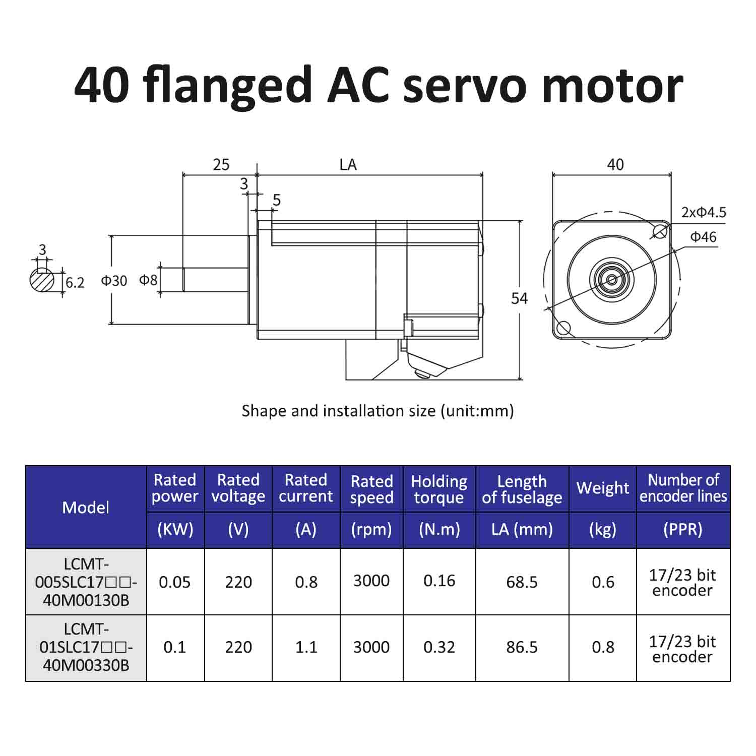 | Model mótair | LCMT-005SLC17-40M00130B | LCMT-01SLC17-40M00330B |
